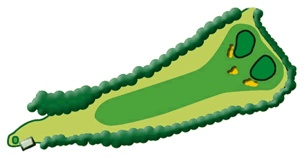 やや打ち上げのミドルホールです。 フェアウェイが広く思い切って打てます。第2打目ではグリーン面が見えないので、ピンの位置にご注意下さい。 また、グリーン前に3つのバンカーが有り花道を絞っていますので、バンカーに入れないよう注意が必要です。